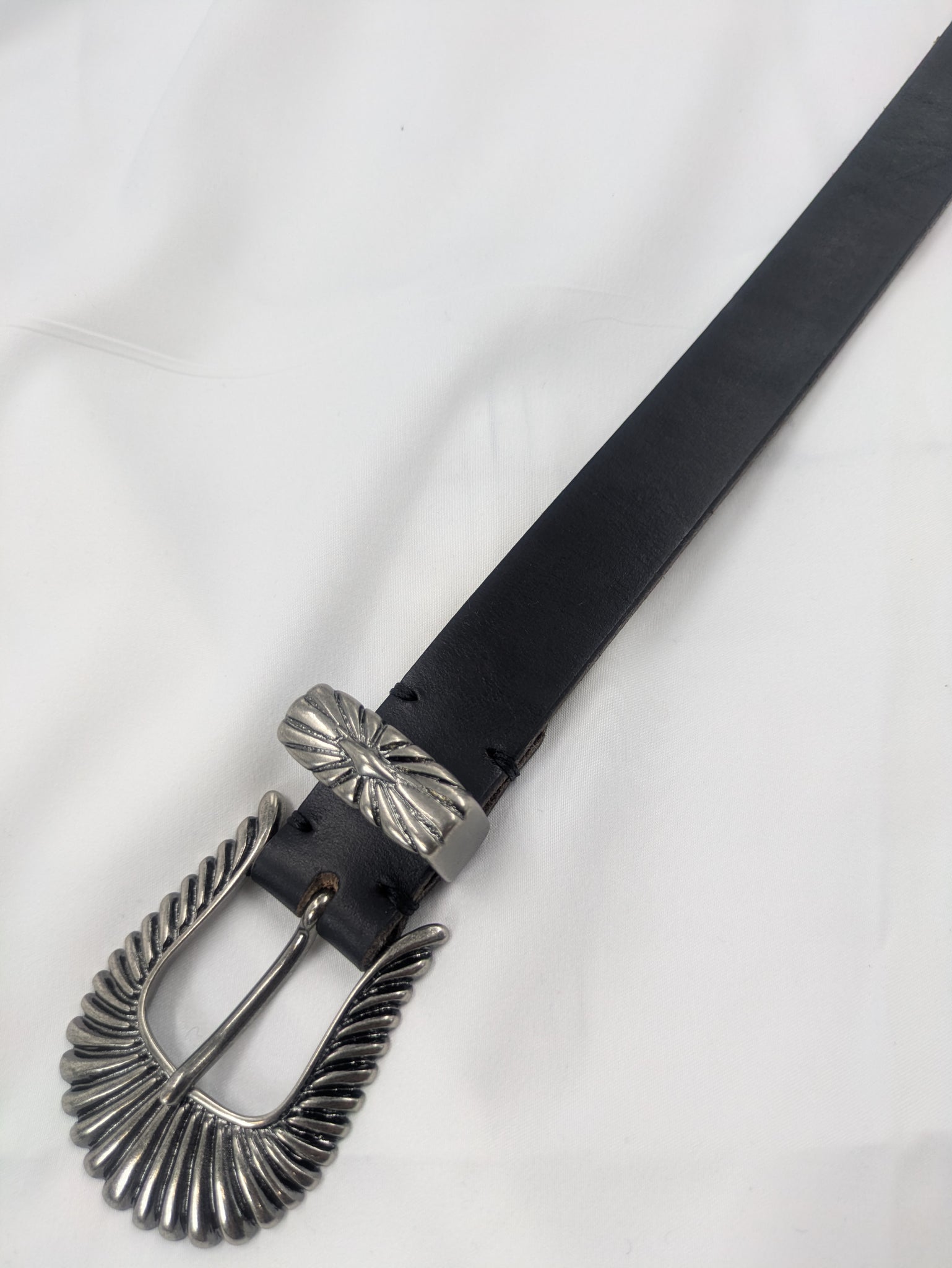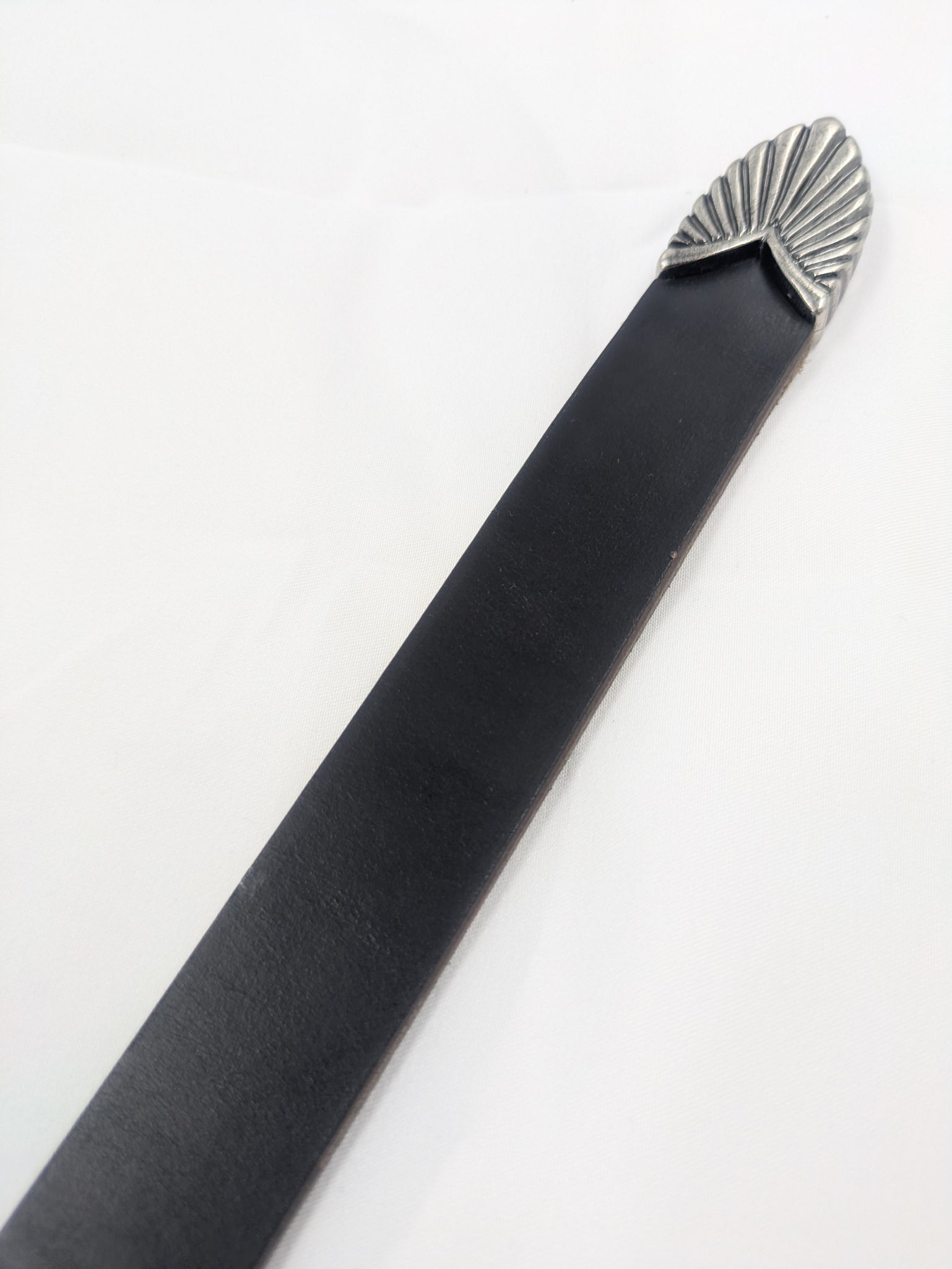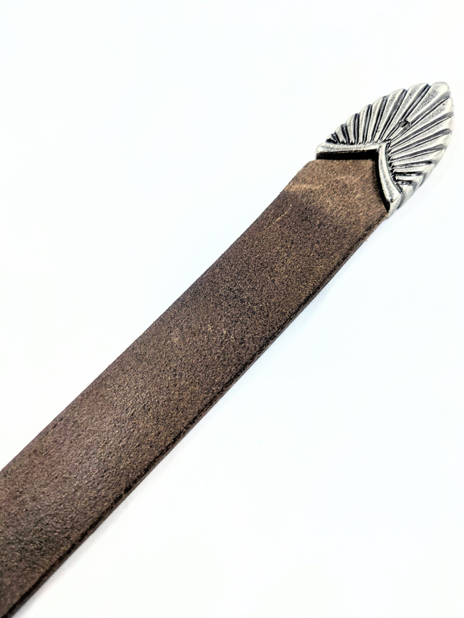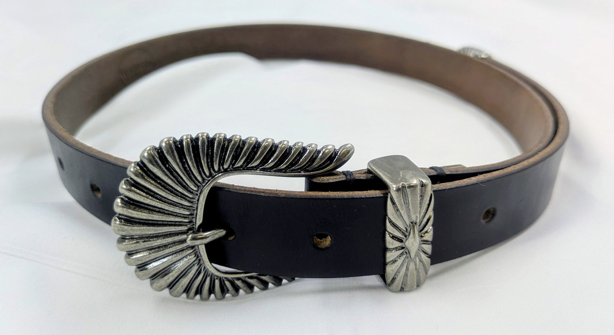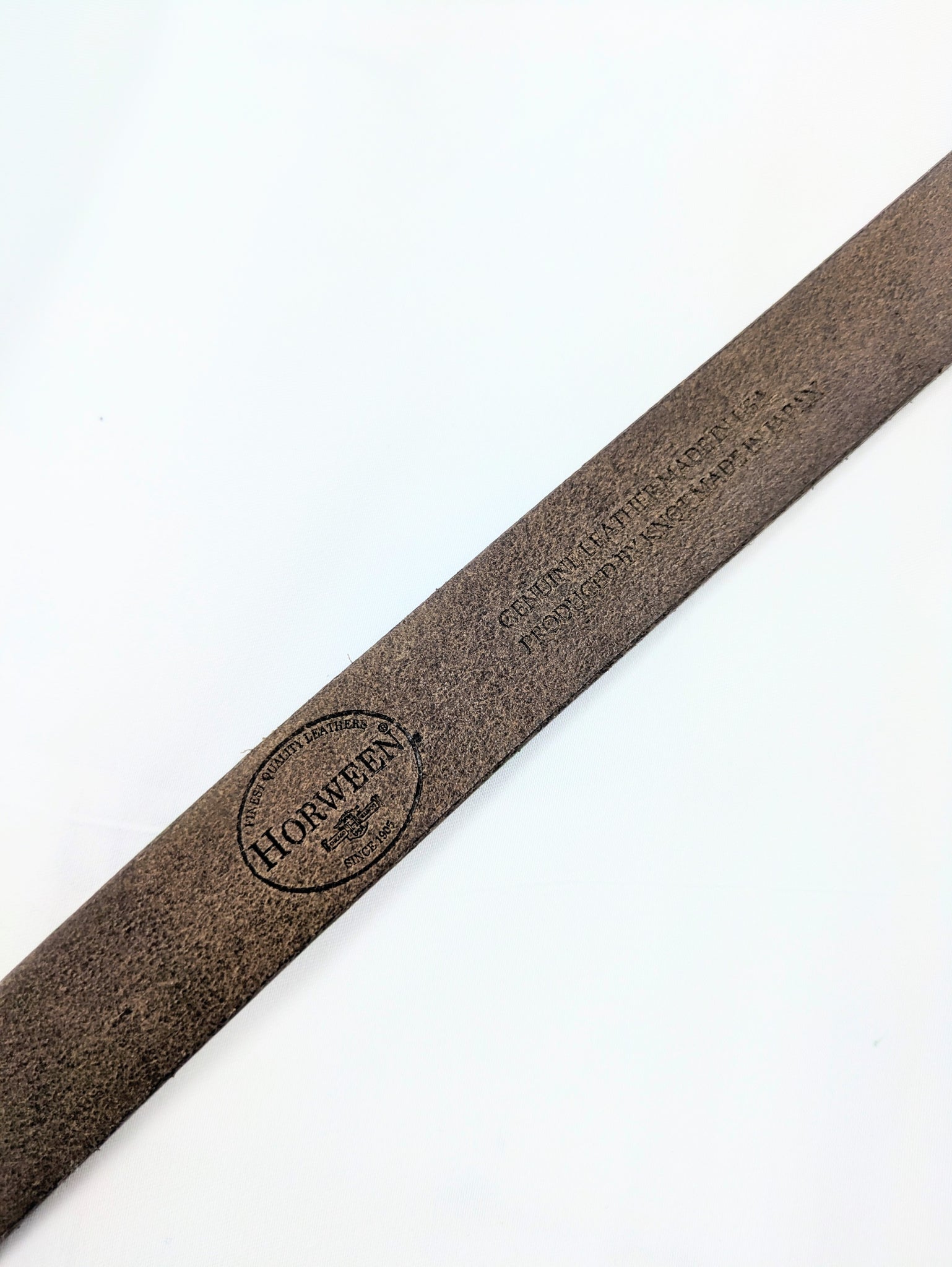 人気ブロガー”masagonia氏”と共同で開発した、ウエスタン風のベルトです。革はアメリカの老舗タンナー”HORWEEN社”のクロムエクセルを使用しました。オイルをたっぷり含んでいてクラシックな雰囲気にピッタリです。厚みは約3.5mm程度のものを使用していますのでしなやかですがしっかりとした印象のベルトです。またウエスタン調のバックル、ループ、先金をアンティークっぽい雰囲気のカラーに仕上げました。バックル部分は頑丈なナイロン糸でハンドステッチで仕上げています。またベルト先端部分の金具の取り付けにもこだわっており、金具の裏側がキレイに見えるように仕上げました。masagonia氏のこだわりを細部まで再現したベルトです。